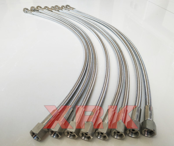 NPT thread stainless steel flexible PTFE hose PTFE inner hose, SS304 or SS316 braided mesh layer, ferrule and NPT thread ends. Stainless steel flexible ptfe hose specifications: 3. Hose size: 1/4inch - 3inch 4. Hose type: smooth or corrugated hose 5. Connect type: NPT thread male or female ends 6. Connector fittings material: SS304, SS316 or carbon steel 7. Maximum working pressure: 26Mpa(depend on hose diameter) 8. Working temperature range: -70℃ ~ +260℃ 9. PTFE hose assembly length: according to your request NPT thread stainless steel flexible PTFE hose application: